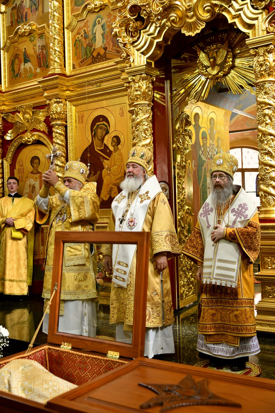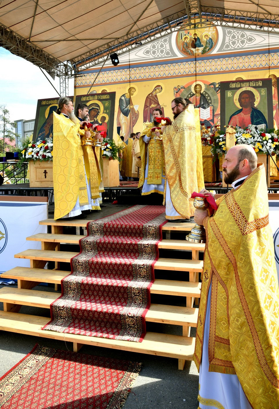 За Литургией молилось около 3 тысяч человек, в том числе представители Сестричеств милосердия и казачества. Причастие происходило из 15 Чаш.
