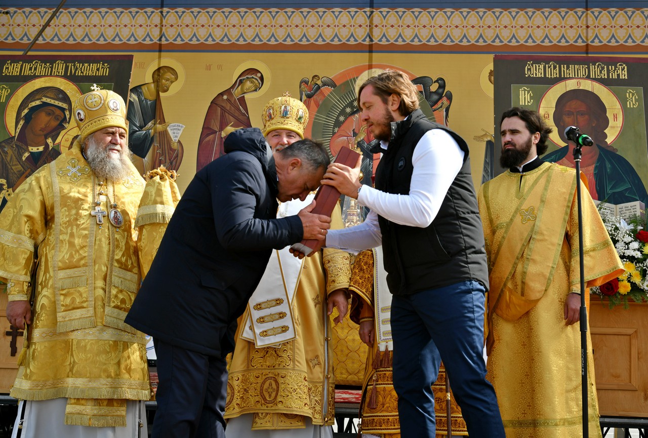 Председатель Фонда имени Иннокентия Сибирякова Дмитрий Николаевич Толоконников также поздравил всех с важным событием и преподнес в подарок Губернатору Игорю Ивановичу Кобзева икону Патриарха Тихона, а митрополиту Максимилиану - напрестольный крест.