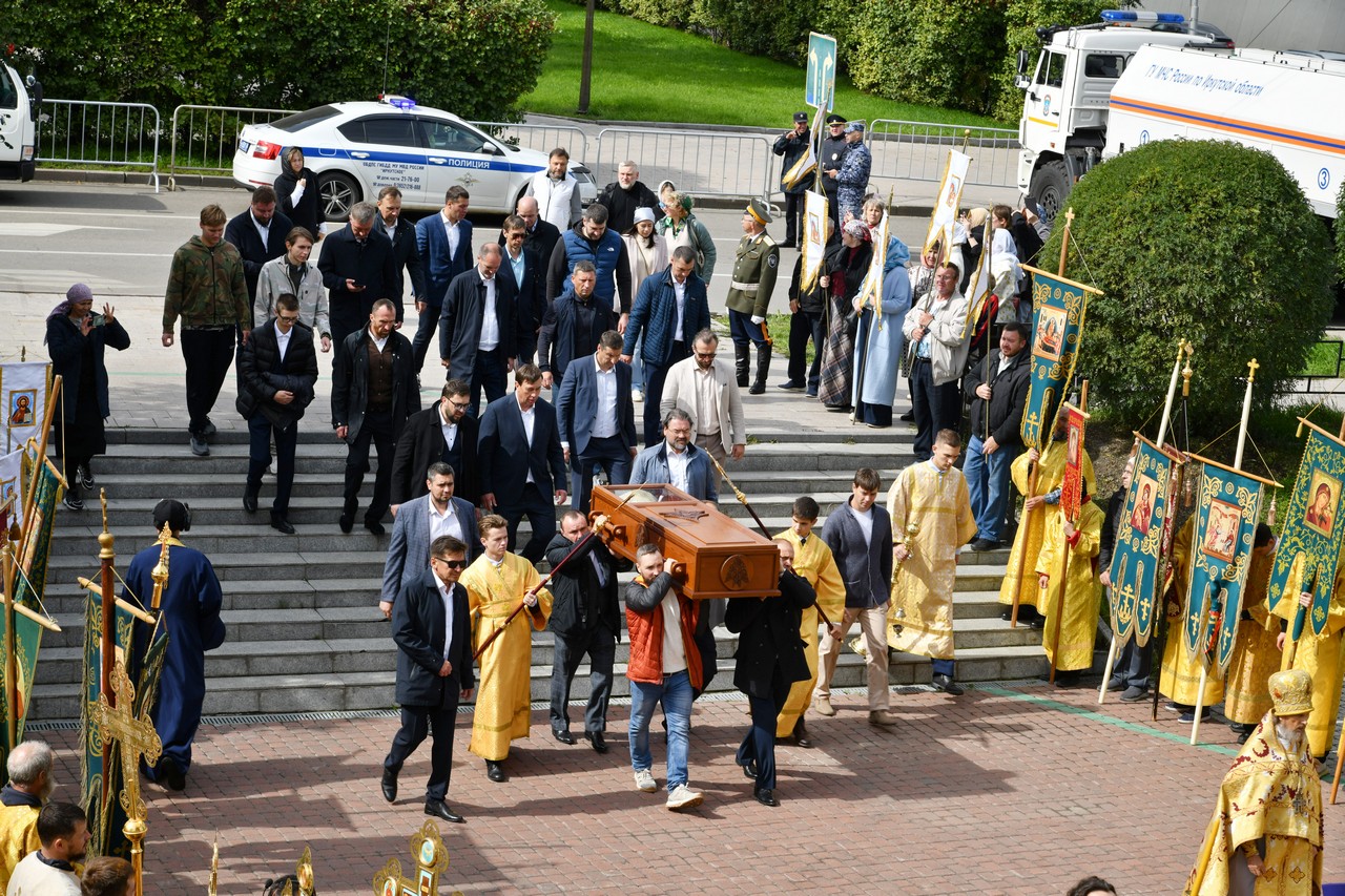 По завершении Литургии состоялся молебен святителю Иннокентию, Первому епископу Иркутскому, и святому Патриарху Тихону, после чего крестный ход с мощами Святителей прошел по улицам Ленина, Карла Маркса и Сухэ-Батора до Богоявленского собора, где владыки, представители администрации области и города, представители силовых структур, священники и все верующие вновь прославили Господа и святых, память которых иркутяне сегодня торжественно почтили, и благоговейно приложились к их святым мощам.