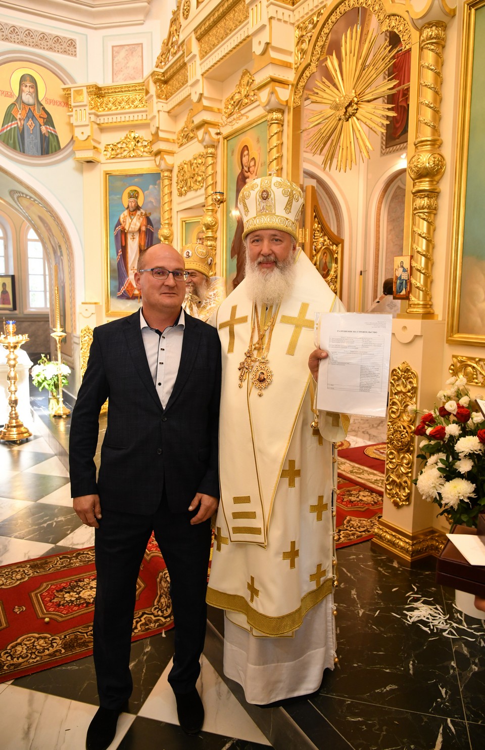 По завершении богослужения митрополит Максимилиан вручил в благодарность за труды по восстановлению собора во Славу Божию Благословенные архиерейские грамоты руководителям «Газпрома» и меценатам: