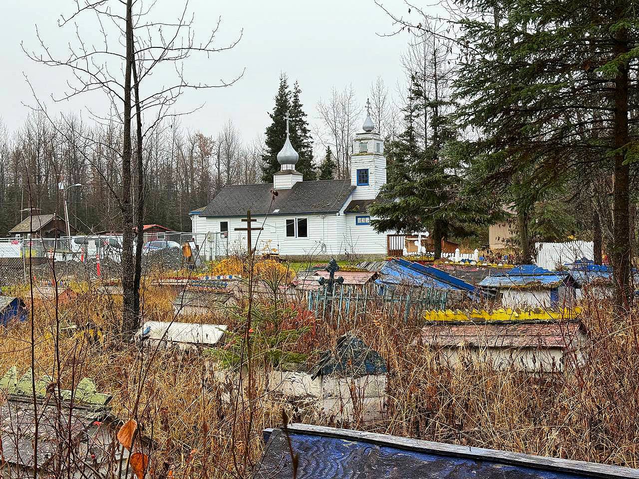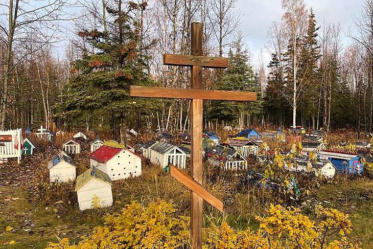 Здесь покоятся индейцы-атабаски, эскимосы племени юпик, а также русские. Кладбище известно тем, что православные кресты соседствуют здесь с небольшими домиками, выкрашенными в яркие цвета. Это дань древним верованиям индейцев-атабасков, которые считали, что над могилой усопшего непременно нужно выстроить небольшой домик, чтобы душа обрела в нем покой.