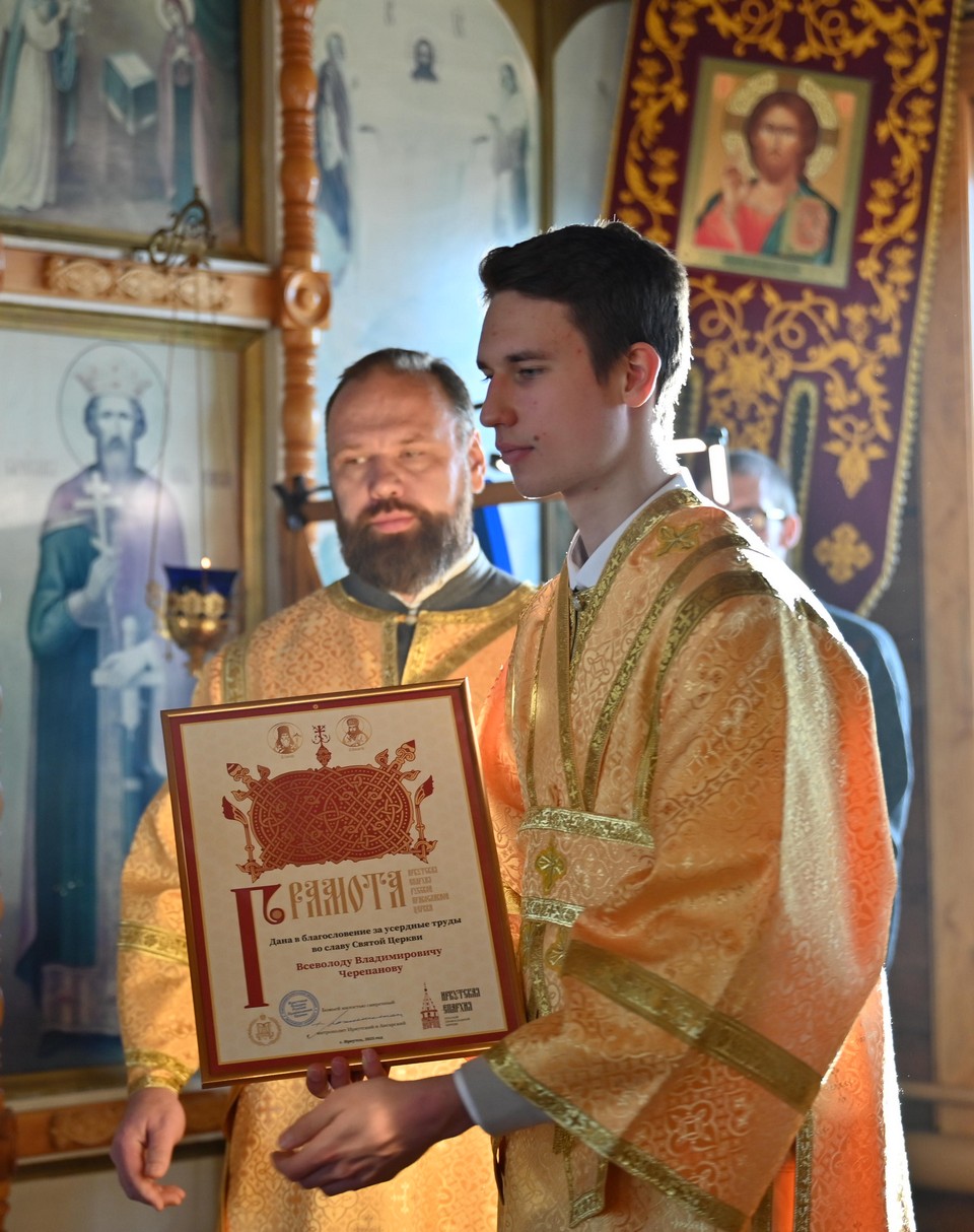 Также правящий архиерей выразил сердечную благодарю настоятелю храма священнику Сергию Калашникову за активную деятельность по восстановлению храма после давнего пожара и вручил благословенные архиерейские грамоты благотворителям, благодаря помощи которых была выстроена новая просторная приходская трапезная: Всеволоду Владимировичу Черепанову и Андрею Олеговичу Татаринову.