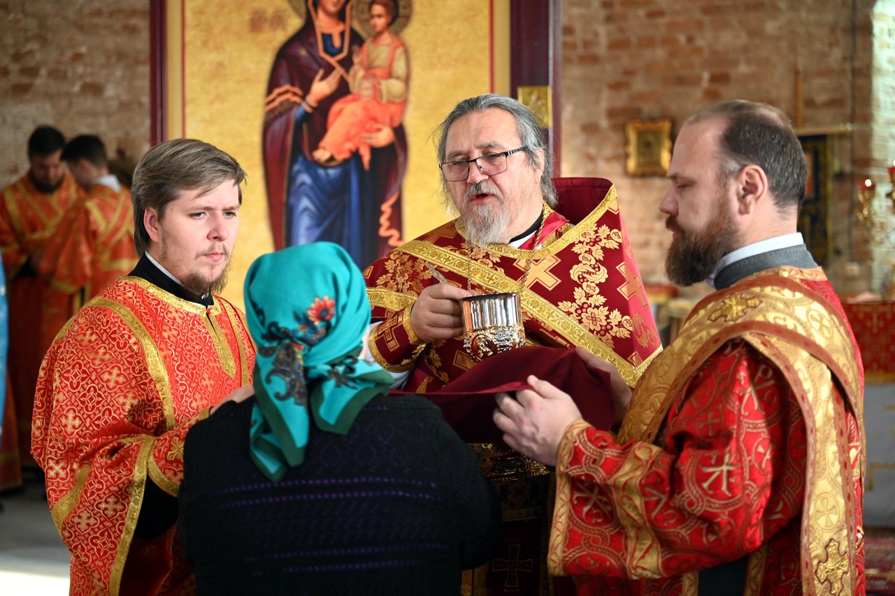 Перед Причастием Святых Христовых Таин настоятель храма священник Максим Гаськов напомнил своей пастве о духовном выборе вмц.Екатерины, когда она встала на путь полного самоотречения ради Христа, и призвал каждого верующего задаться вопросом, может ли и он поступить так же и ради Христа искоренить в себе все недостойные страсти, заменив их противоположными добродетелями.