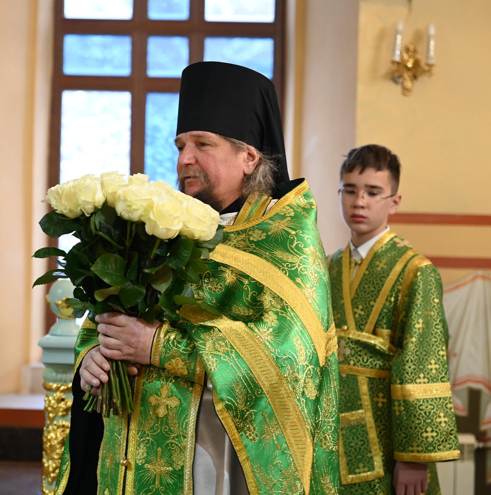 Игумен Феофан от лица духовенства, сестер и прихожан монастыря поздравил правящего архиерея с дважды важным днем в его жизни и преподнес ему букет белых роз.