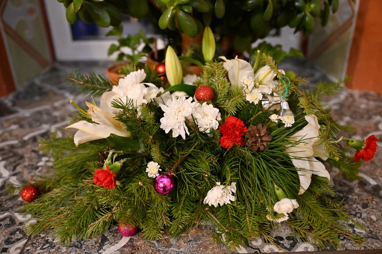 Благочинный протоиерей Вячеслав Пушкарев также поблагодарил владыку за внимание, пожелал ему доброго здравия, испросив прощения за всё прегрешения, вольные и невольные, и преподнес правящему архиерею букет из 29 алых роз - по числу лет, в продолжении которых живет Свято-Троицкий храм с.Хомутово.
