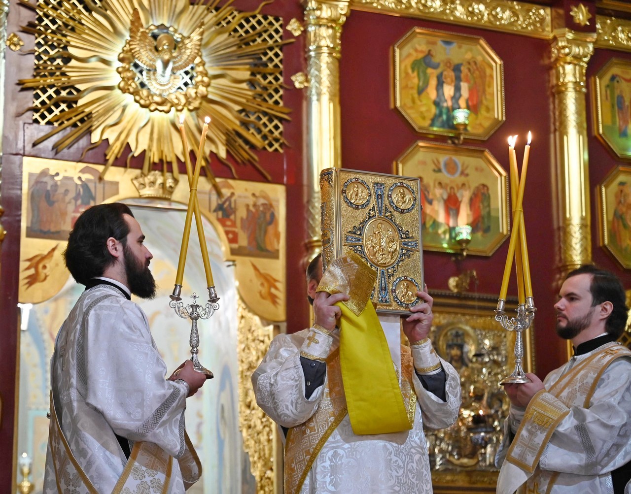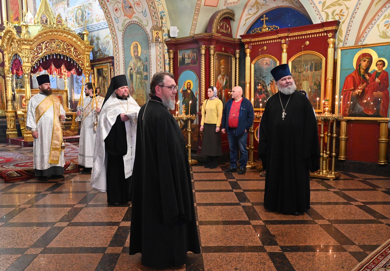 Его Высокопреосвященству сослужили ключарь собора игумен Феофан (Евтихеев), секретарь Иркутской епархии священник Стефан Бажков, благочинный I-го Иркутского церковного районного округа протоиерей Герман Кузнецов, духовенство благочиния и клирики Знаменского собора.
