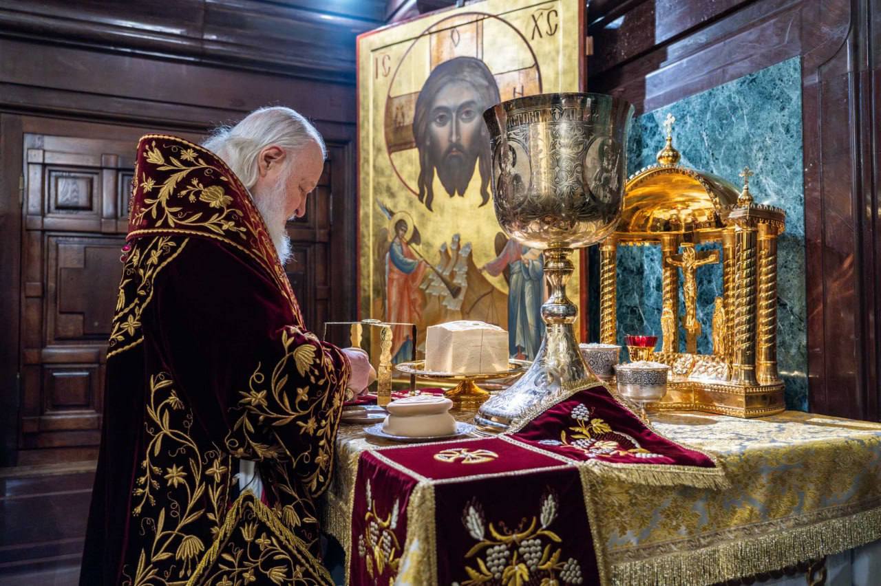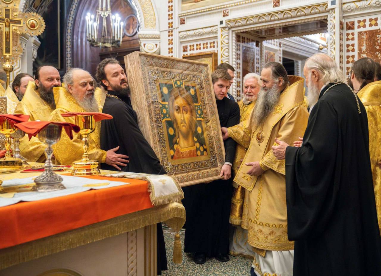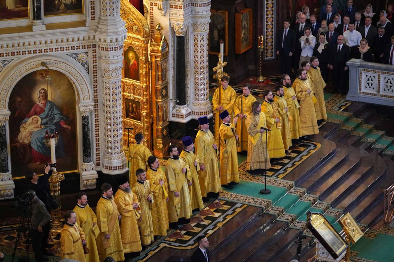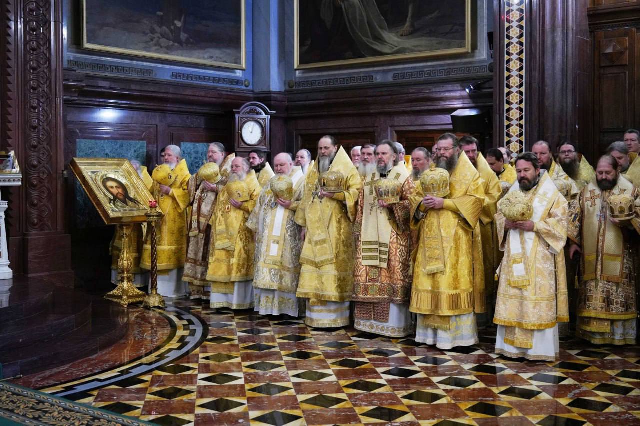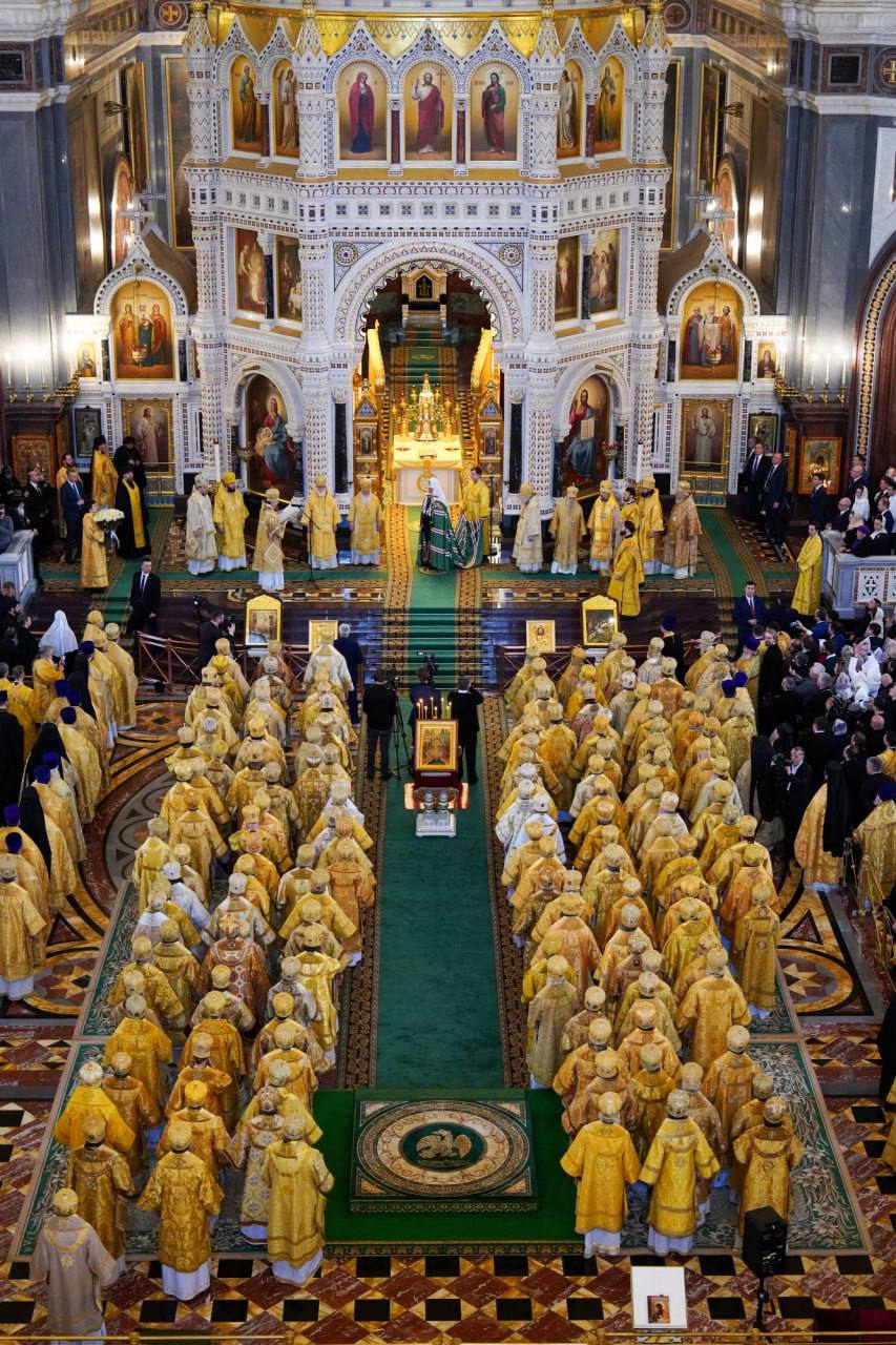 В этот знаменательный день Святейший Патриарх Кирилл совершил Божественную литургию в кафедральном соборном Храме Христа Спасителя в Москве в интронизационных облачениях и с копией жезла святителя Петра.