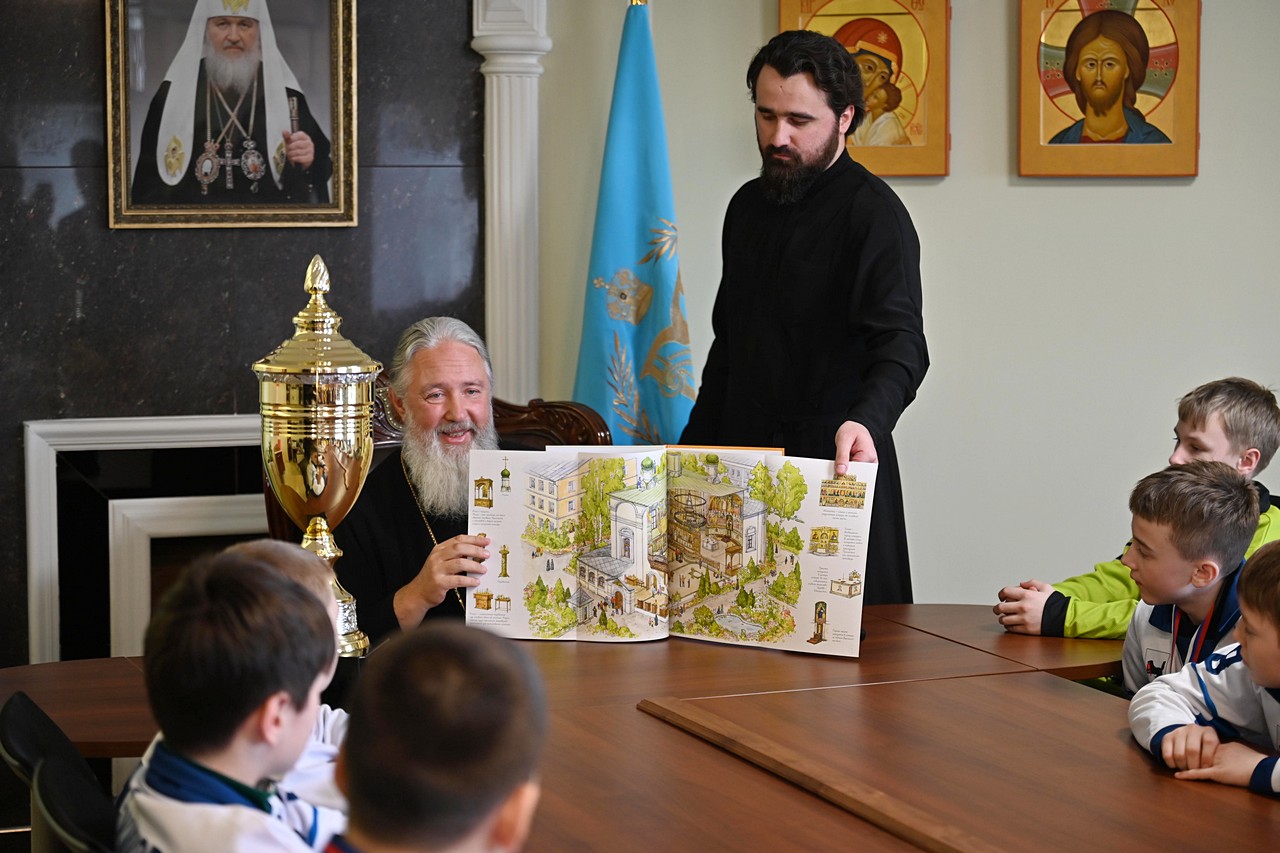 Владыка Максимилиан побеседовал с ребятами о святителе Иннокентии Иркутском - небесном покровителе Иркутского юношеского турнира по хоккею с мячом, заинтересованно расспросил их об игре в финале и о впечатлениях от поездки, ответил на вопросы ребят.