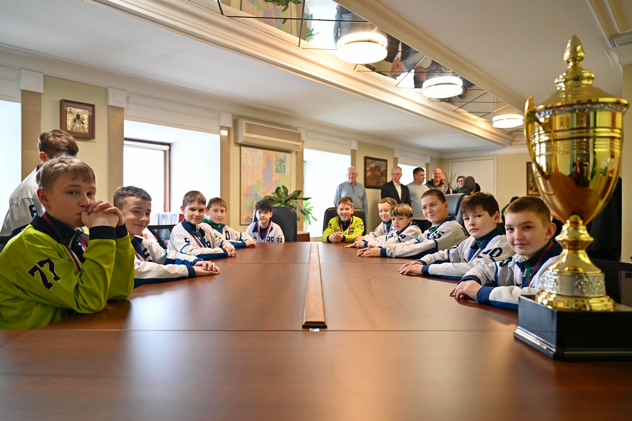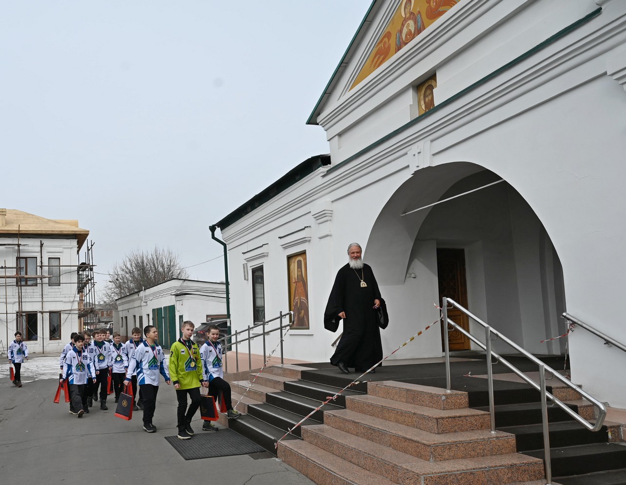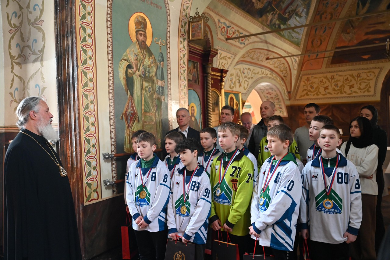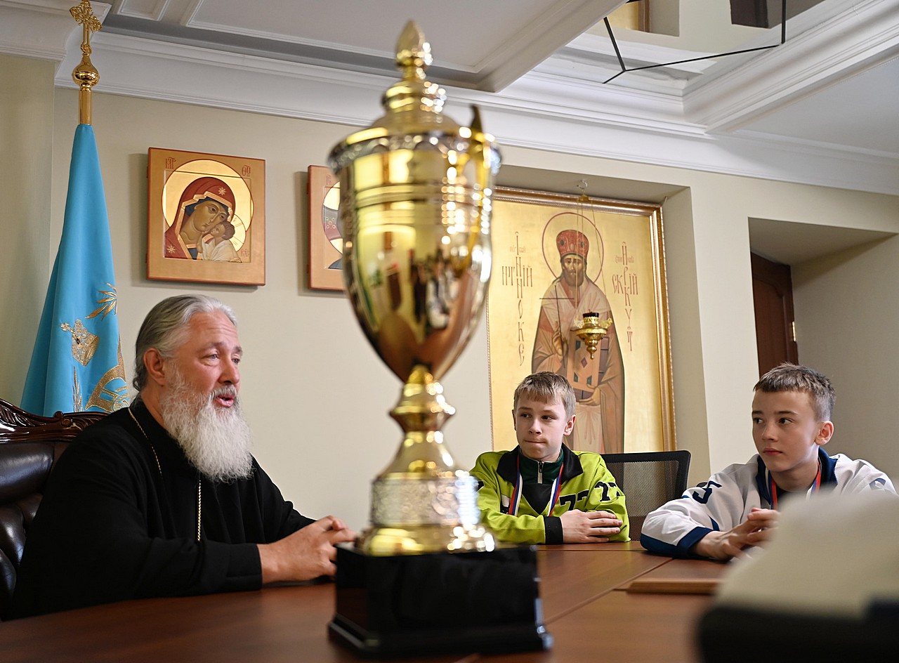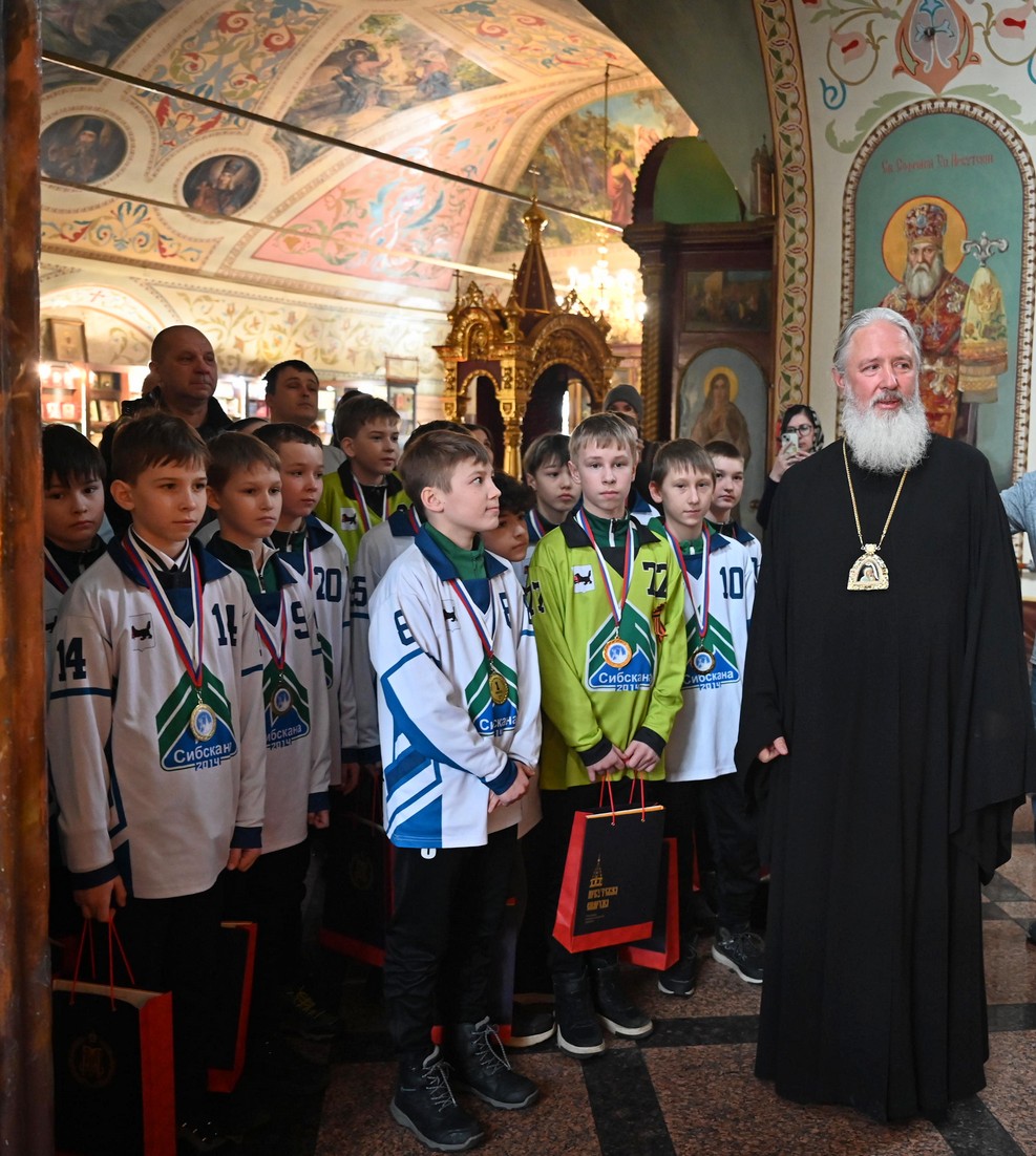 Победители прибыли в гости к правящему архиерею с выигранным кубком, в форме клуба. Их сопровождали заместитель директора ОГБУ «Спортивная школа по хоккею с мячом «Сибскана» Василий Карелин, тренеры Александр Межуев и Алексей Баженов, родители юных хоккеистов и их духовные наставники - священники Максим Гаськов и Виктор Черненко.