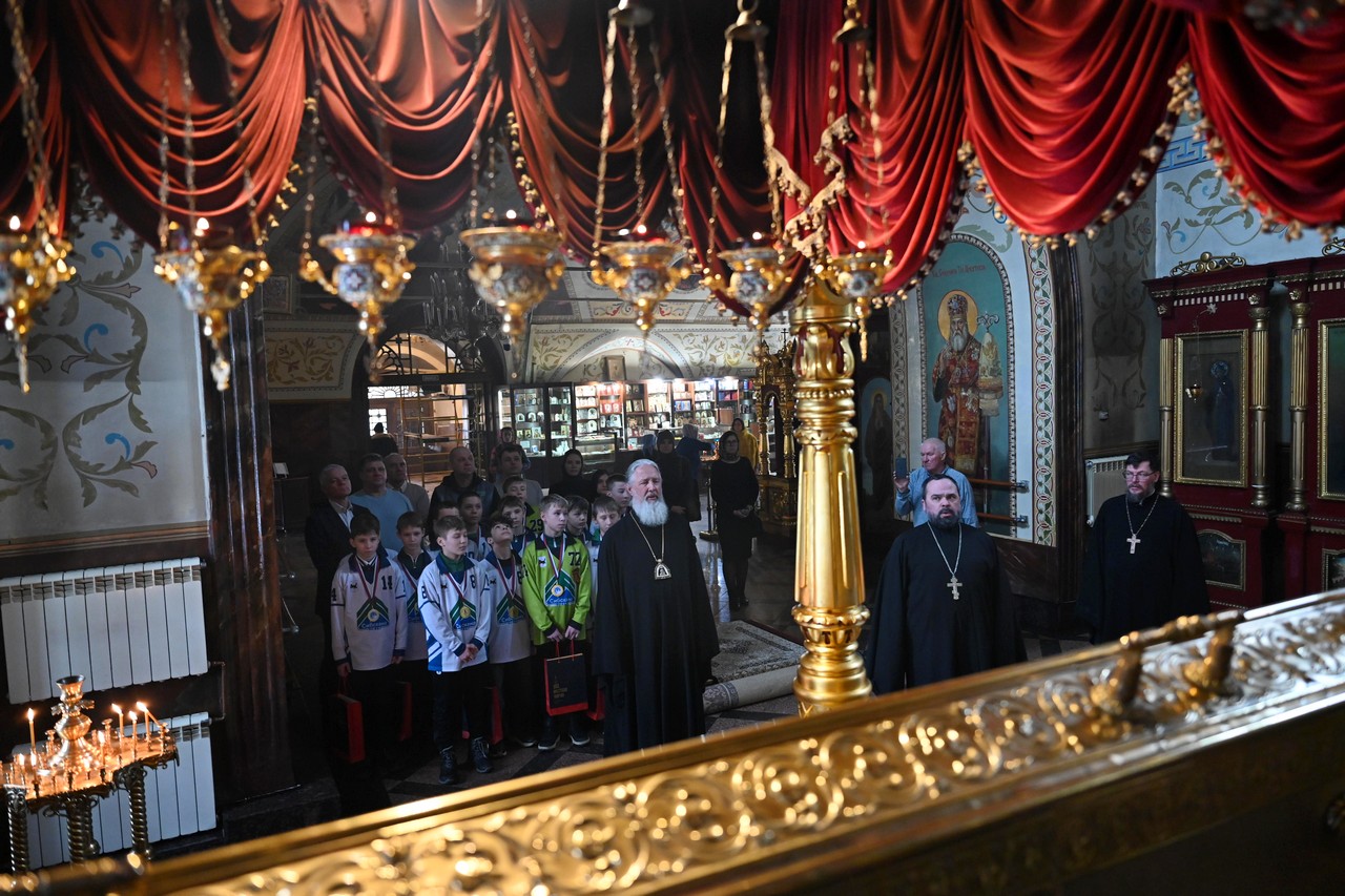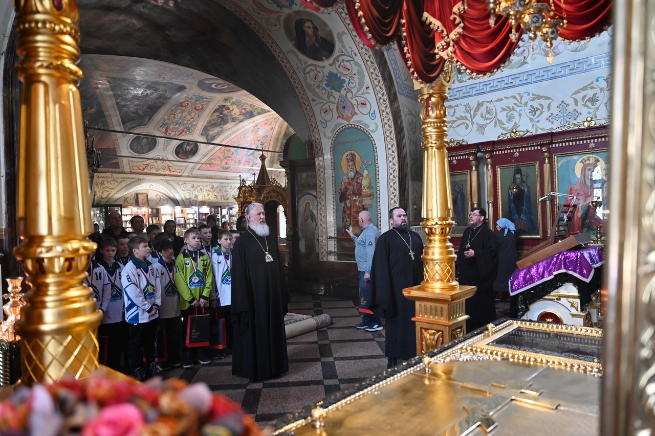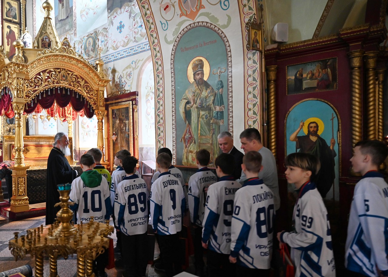 По завершении беседы правящий архиерей помолился вместе с ребятами святителю Иннокентию перед его иконой и святыми мощами в Знаменском соборе и преподнес в подарок каждому игроку книгу об устройстве храма и икону святителя Иннокентия Иркутского🧔♂, а также получил в подарок от команды медаль - точную копию медали, заслуженно полученной хоккеистами на Патриаршием турнире.
