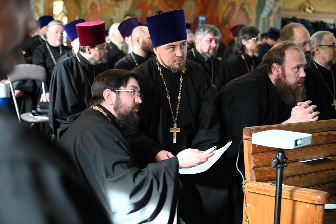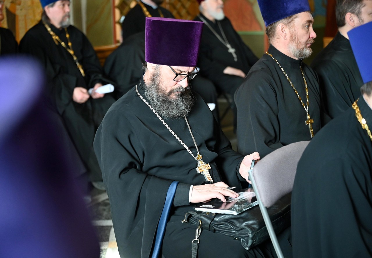 Собрание началось с приветственного слова правящего архиерея, в котором владыка поблагодарил клириков за их труды в течение года, пожелал иметь в сердцах соборное чувство, принимать консолидированные решения ради Христова дела, ставить соборное выше частного, а епархиальное выше приходского.
