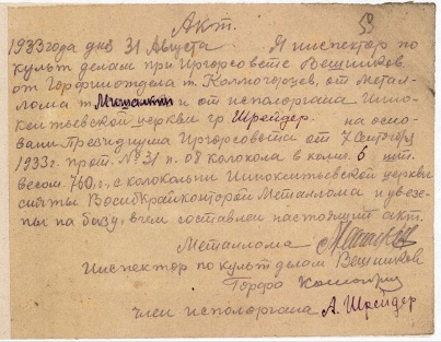 Жизнь храма оказалось недолгой. Из архивных документов мы узнали, что в 1932 г. в храме ещё велись службы, на приходских собраниях принимались решения по бытовым и финансовым вопросам. В это страшное время в храме служили Ларев Вениамин Петрович, Иоанн Фёдорович Кремлёв, Фёдор Михайлович Шмаков, Емельян Павлович Зборжевецкий, Елеозар Лаврентьевич Скиба.