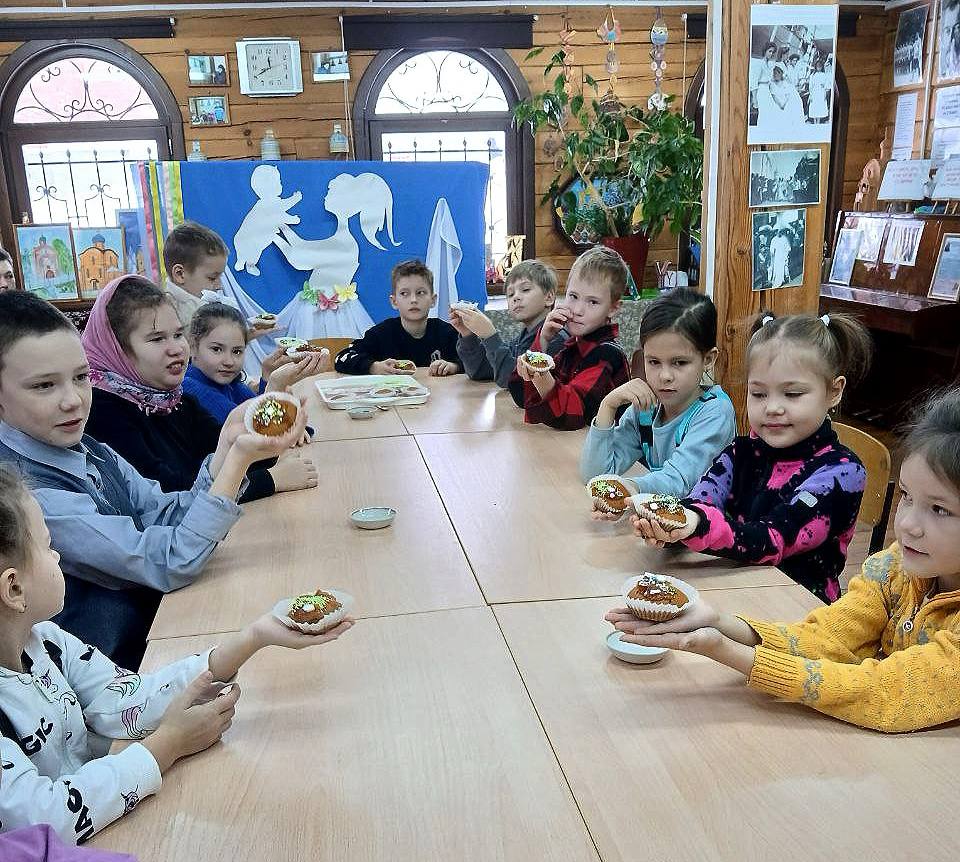 В конце занятия ребята своими руками изготовили поздравительные открытки и украсили кексы, которые заранее испекла повар трапезной Светлана Викторовна.