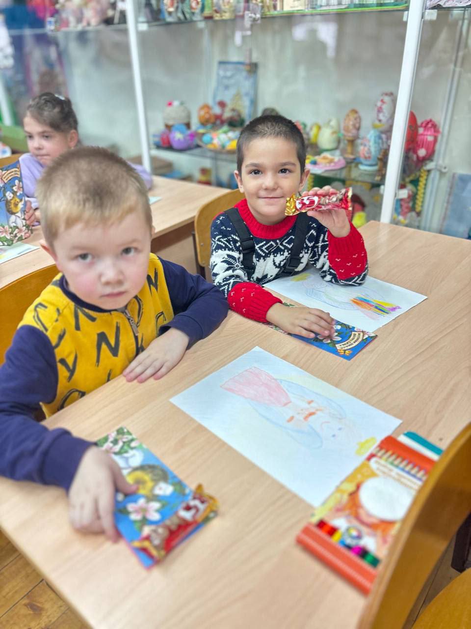 Небольшие сюрпризы получили в конце занятия и дети - каждому досталась в подарок раскраска и конфетки.