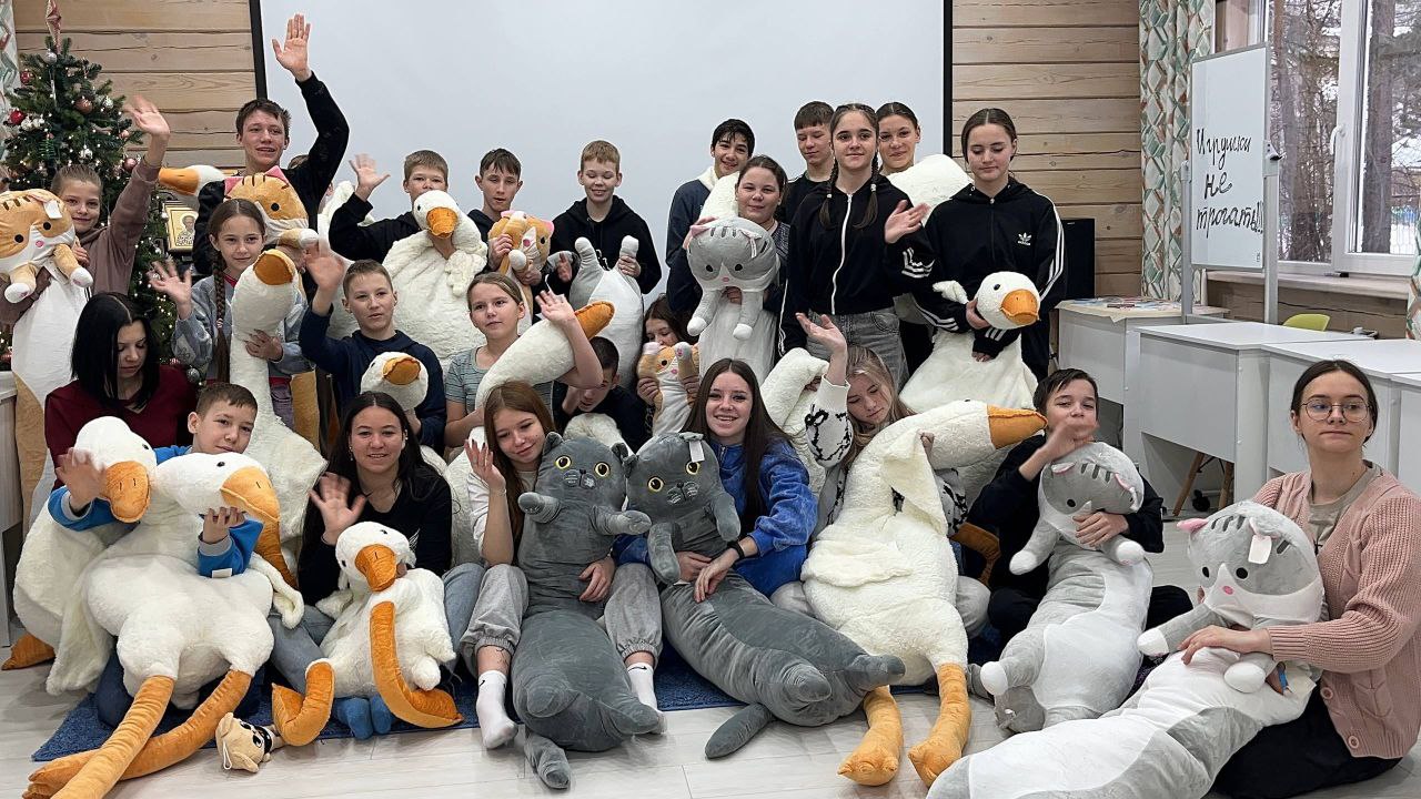 в воскресной школе за столами каждого поджидал пушистый друг — большой плюшевый кот-батон или уютный гусь-обнимусь!